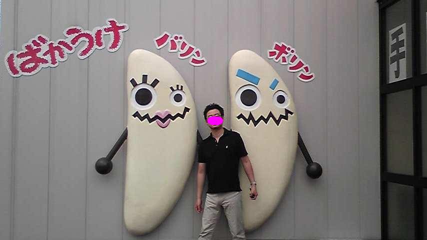 ばかうけのキャラクター『バリン、ボリン』と記念撮影の食通人。 携帯で無理やり取ろうとしたら、素敵な女性の方が撮影してくださるとのことで遠慮なく。 緊張してポーズが固い。