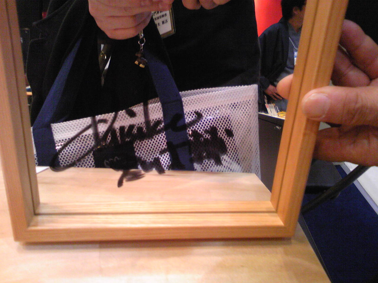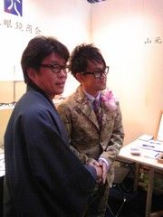 時間があったのでアポイントしてませんでしたが山元眼鏡さんへ乱入すると、皆さんそわそわと興奮状態。 お聞きすると『これから宮川大輔さんがうちのブースに来るんです!』とのこと。 『一緒に見ませんか?』と誘ってもらったのでスタッフのふりして待っていると、まずは梨花さんが通っていったが無感動、バブル青田のほうが面白かったのに。 そして、、、