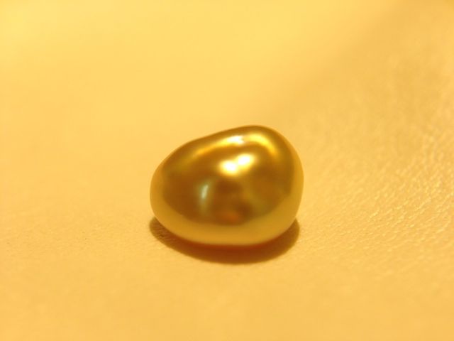 となるとその砂粒がいびつであればこんな感じの通称バロック(いびつなと言う意味です)型と言われる真珠になります。 この真珠は吉田選手が貰った金の真珠、南洋真珠のゴールド珠です。