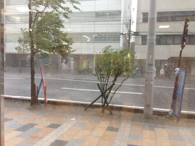 奇麗なぐらいの斜め45度に大粒の雨が降りました、しかもこの後がさらに雨の大きさがアップしてこのままじゃ駅前水没か?というぐらいでした。