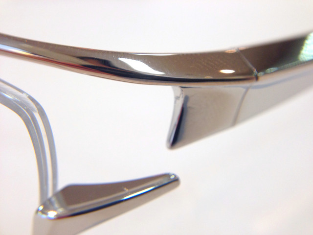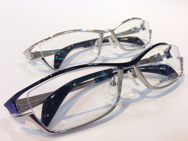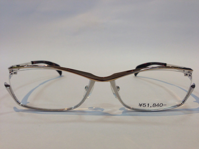 フロントからテンプルにかけての流れがとても美しい眼鏡です。 フロント上部のブローパーツはβチタン製ですので、レンズに負荷がかかることなくまた快適な掛け心地です。