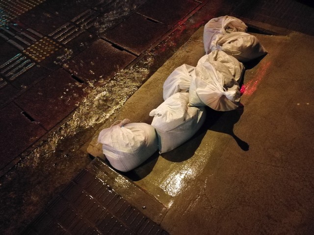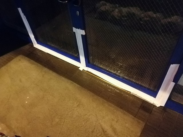土曜日の15時前にお店を出て、防水テープでドアの隙間を貼って帰宅。 夕方8半頃、雨が強くなってきましたので確認しに来ましたが画像の様に、水が段々と溜まってきているようでした。 防水テープがまだ効いているので大丈夫だろうと家に戻りました。 天気予報で9時までがピークと思いきや、さらに雨風が強くなりスマートフォンの川の氾濫警報などが頻繁になって怖いのなんの。 熟睡できず、朝は早めに起きて出勤いたしました。