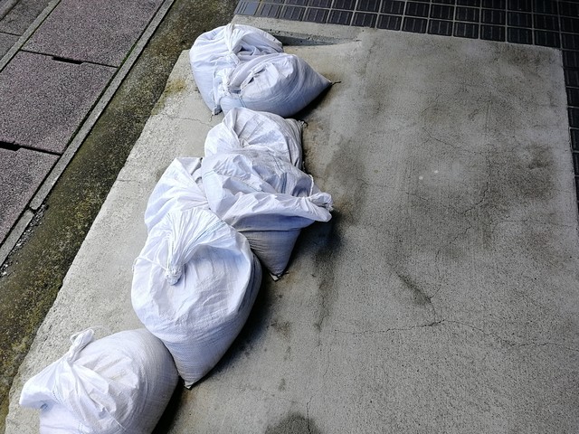 土嚢はそのままで防水テープも剥がれておらずに無事! テープを剥がしているとお近くのお客様から「ここ良く水があがるからね! 大丈夫?」と、お声を掛けて頂きました。