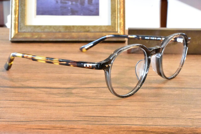 フロントはクリアのグレーにテンプルはアクセントのあるデミブラウン。