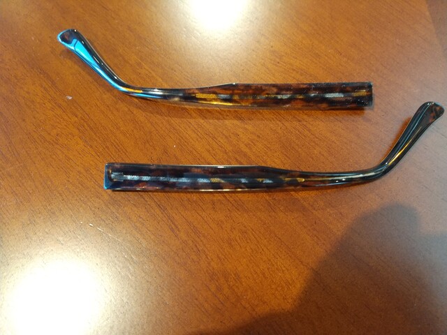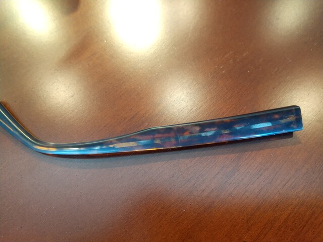 アセテート、セルロイドの眼鏡は経年劣化で、表面に可塑剤が浮いてきて光沢が鈍くなり、白っぽくなってしまいます。 これはきちんとお使い頂いても素材の宿命で仕方がないことなのですが、磨き直しをすることができます。