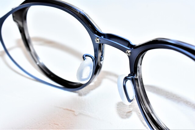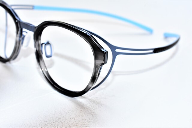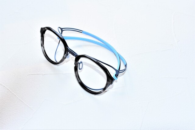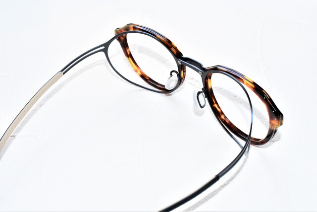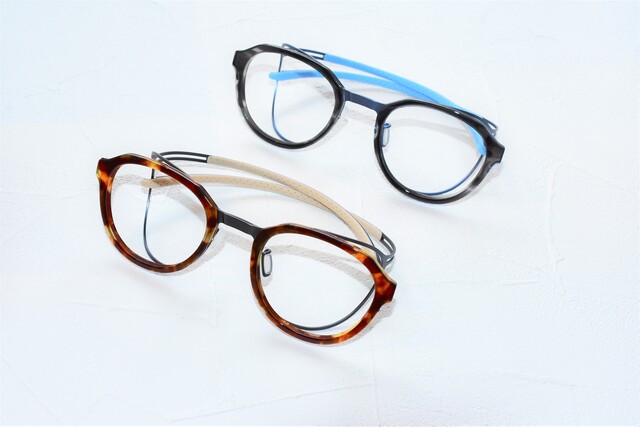 クラウンパント型でブロウラインを平らにしたラインです。プラスチックとメタルのコンビネーションで。レンズ部分は独立しており、掛ける時の負荷はネジの無いテンプルがしなやかに可動し解消します。