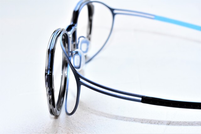 透明感のあるグレーカラーが清涼感があります。メタルのブルーとテンプル内側の鮮やかなブルーがとても映えます。