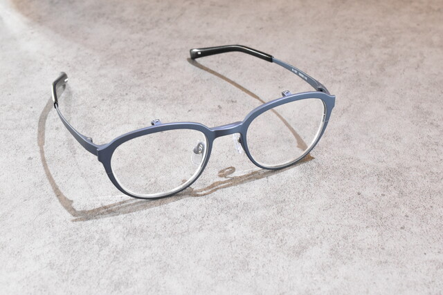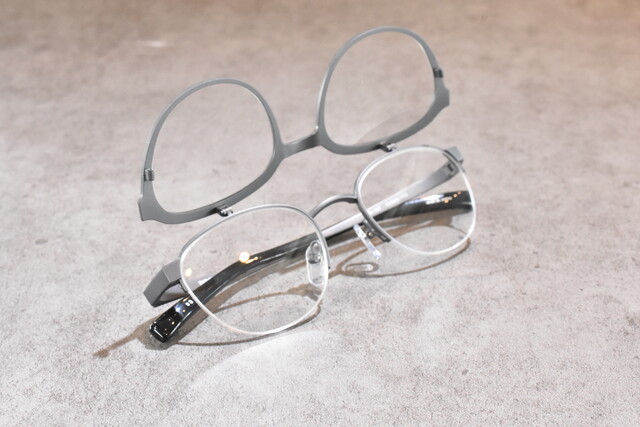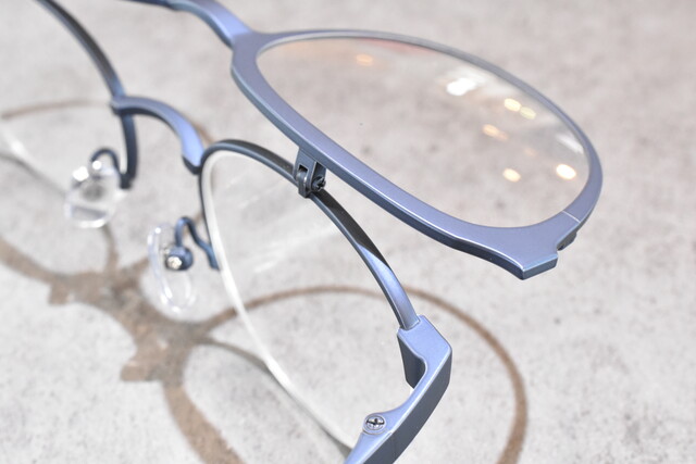 本日ご紹介させて頂きますのはRIDOL-リドル-の複式の跳ね上げスタイルで前後で見え方の使い分けができます。遠近両用のレンズが合わない方や、お仕事用に手元用とパソコンの距離用で近用を使い分けたりと、使い方次第で生活スタイルをより快適にしてくれるフレームです。