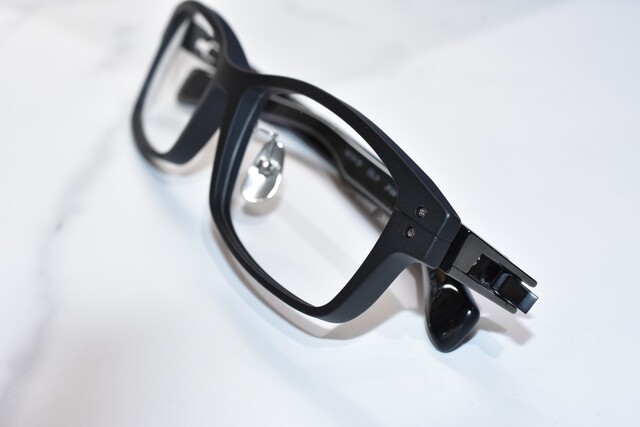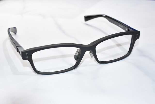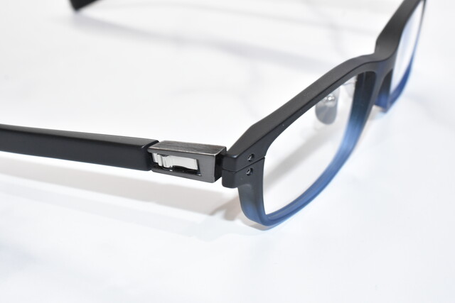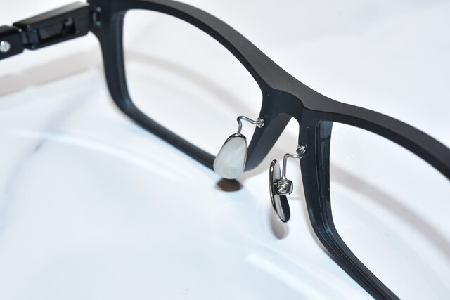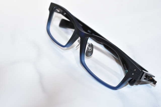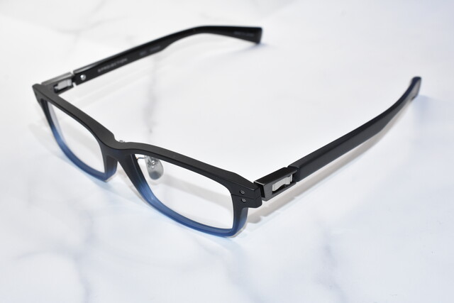 フロントに合わせマット調の異素材のアセテートのテンプルが見事に融合されています。チタンのシルバーの鼻パットが見た目の重さを軽やかにし全体のバランスをとっています。