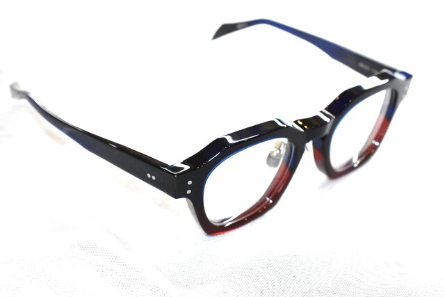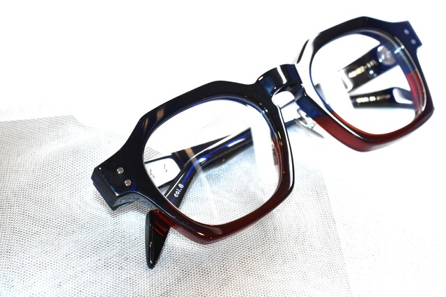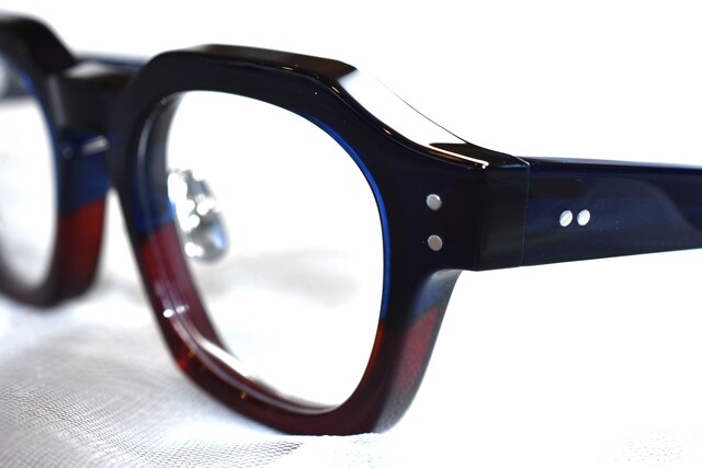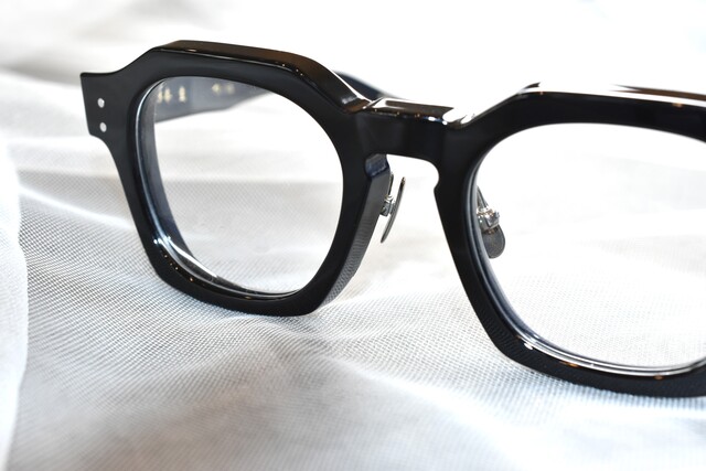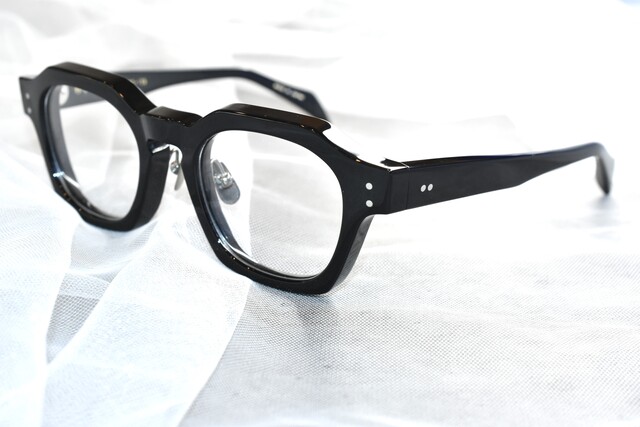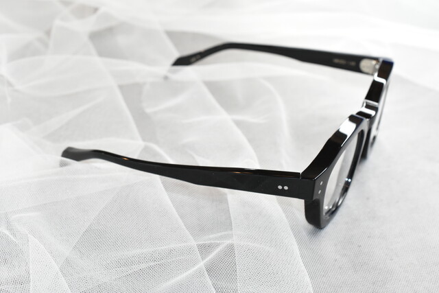 レンズシェイプはウェリントンでリムは肉厚の多角形になっています。職人さんの丁寧な作り込みをたっぷり味わえる高い存在感は工芸品として見ているだけでも豊かな気持ちにしてくれます。