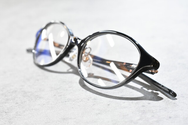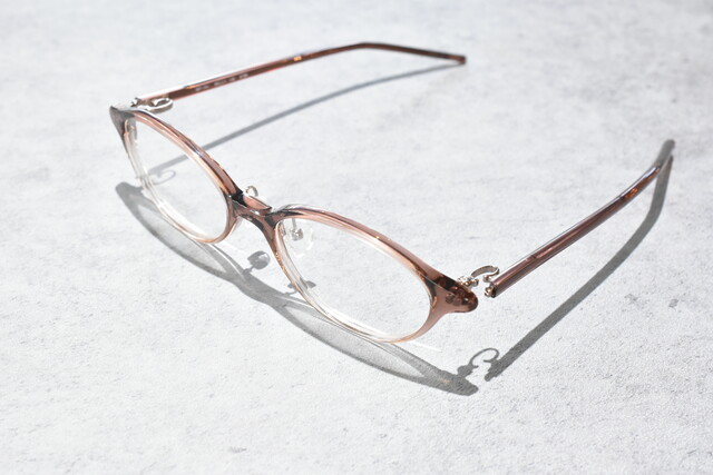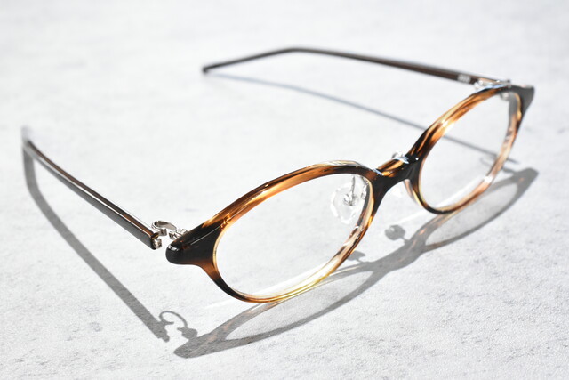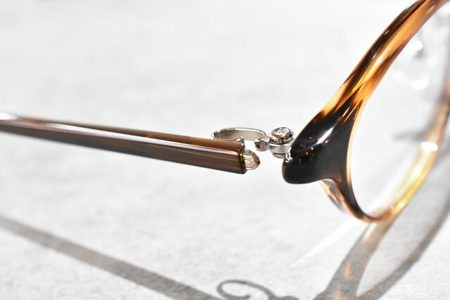 智元とテンプルから覗くメタルがさり気なく上質さを出し、他はシンプルに仕上げすっきりとした印象でお掛けいただけます。フロントの印象のままテンプルも細く仕上げ一体感があります。