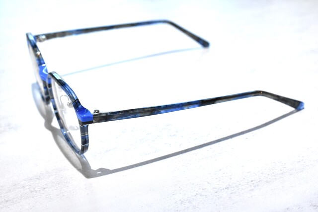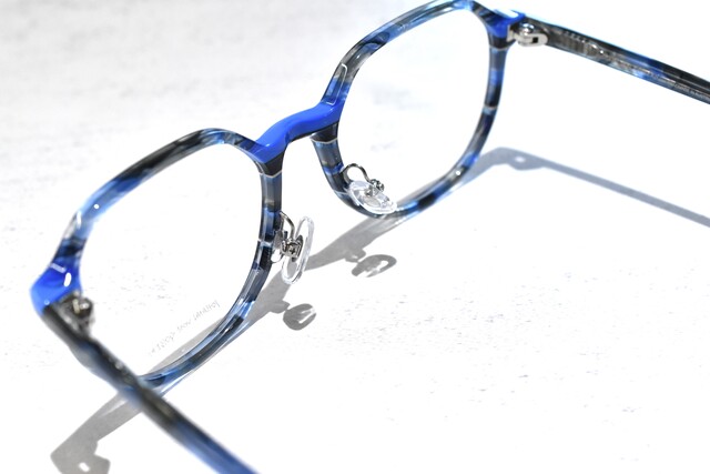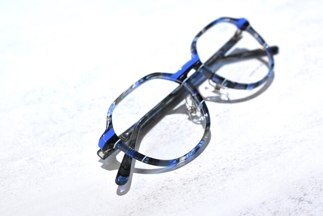 ブルーとグレーを基調としてあり、深いカラーが多く使われているので派手な印象にならずに掛けられます。ブリッジと智元に鮮やかなブルーと細くっ入ったホワイトラインがアクセントになっています。