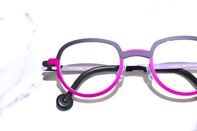 Theo-テオ-の新作「mong-kok」のビビットなピンクカラー目を惹くフレームです。このモデルの名前「mong-kok モンコック」.香港の九龍半島中部の油尖旺区にある繁華街の旺角です。毎度わくわくさせてくれるテーマがあるのがTheoです。