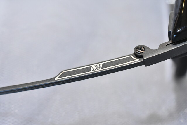 ”999.9”のロゴと、”Glasses should be fine Tools”(メガネは良き道具でなければならない)という999.9のコンセプトがテンプルパーツに刻印されており特別感があります。