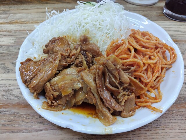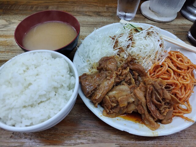 生姜焼き定食です! 豚肉には甘めの味付けで付け合わせのスパゲッティがまた美味しいのです。